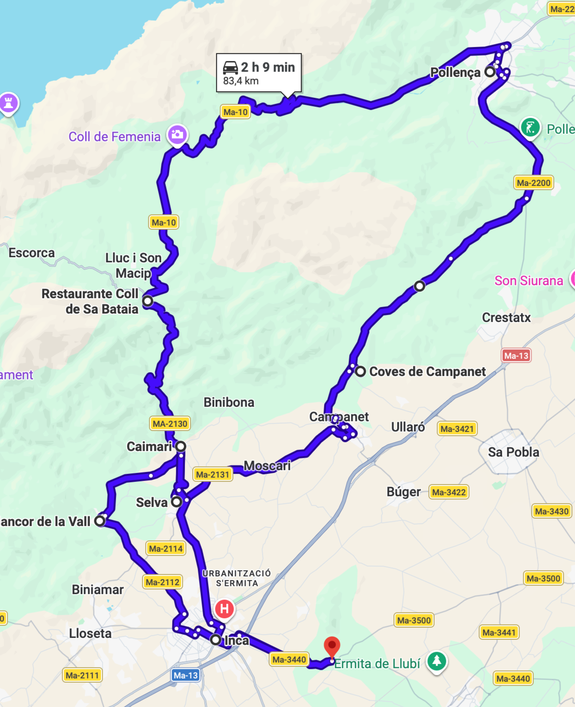 via Manor, Caimari, Selva, Campanet, Pollensa, Luc and Return to Inca.